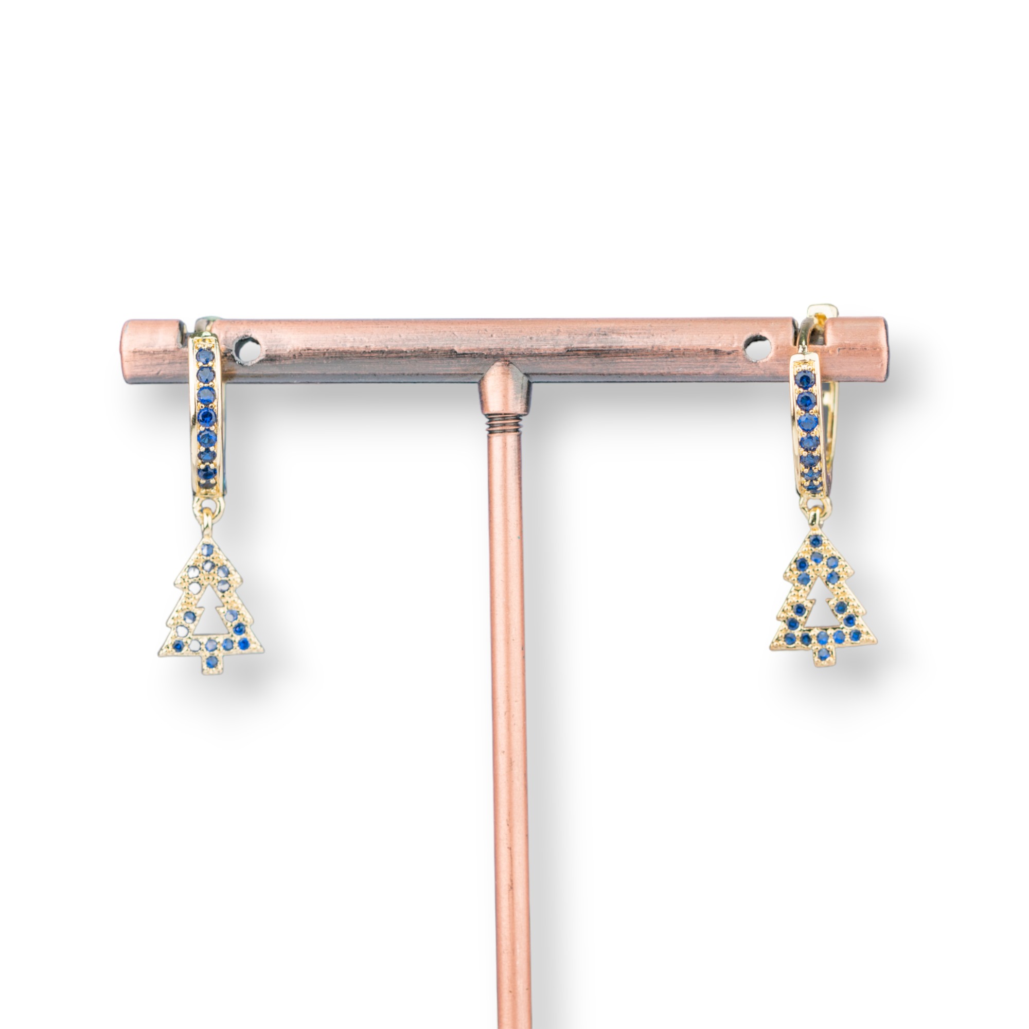 Orecchini Perno Di Bronzo Con Zirconi E Pendente Fantasia 9x26mm Albero Dorato Blu