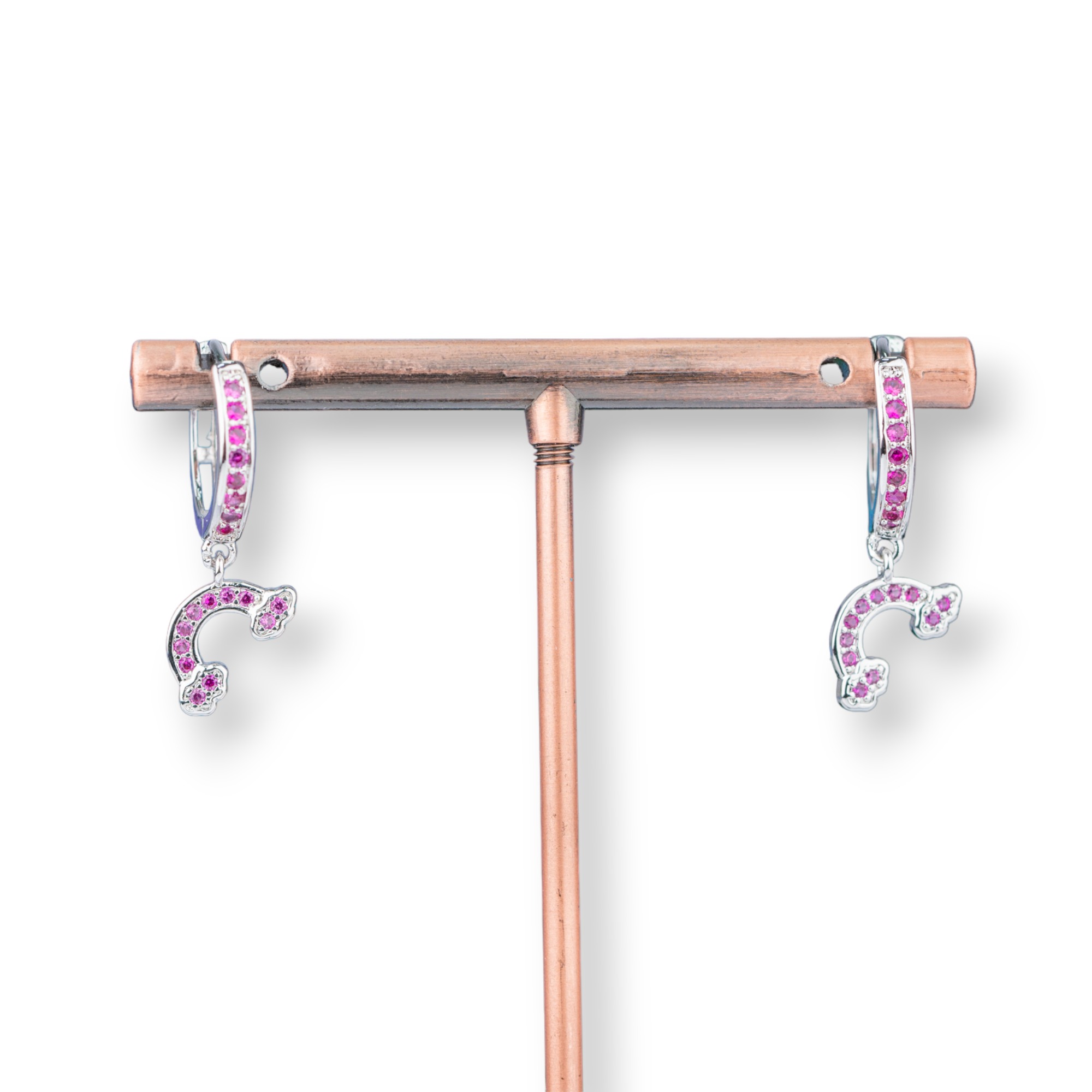 Orecchini Perno Di Bronzo Con Zirconi E Pendente Fantasia 9x26mm Arcobaleno Rodiato Rosa